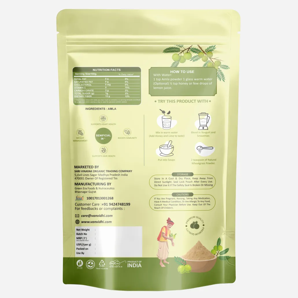 Vanvidhi Amla Powder is made from handpicked, sun-dried Indian gooseberries — a potent source of natural Vitamin C and antioxidants. Revered in Ayurveda, amla helps boost immunity, purify the body, and support healthy skin and hair. Regular use nourishes the scalp, improves digestion, and enhances overall wellness from within.How to Use: Add 1 teaspoon to smoothies, juices, or warm water daily. For hair, mix with water or aloe vera gel and apply as a natural hair mask.