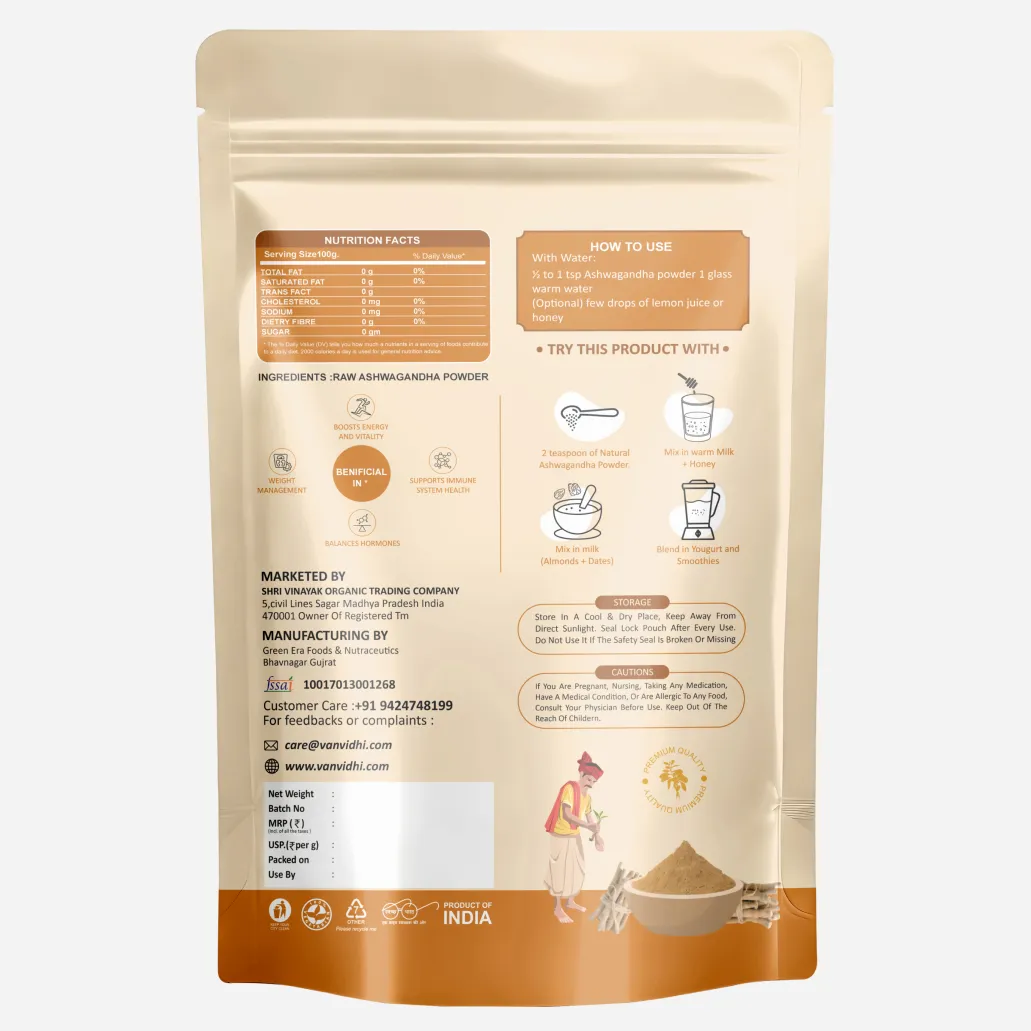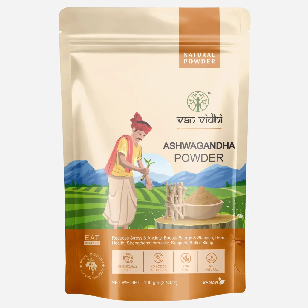 Vanvidhi Ashwagandha Powder is derived from the finest roots of organically grown ashwagandha — an ancient Ayurvedic herb known for its rejuvenating properties. It helps the body adapt to stress, enhances physical performance, and supports hormonal balance. Regular use promotes calmness, focus, and natural energy.